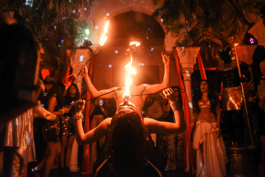This option features captivating performances with fire props such as candle trays, candelabras, fire torches, and fire fans. These shows can be adapted for both indoor and small outdoor areas.